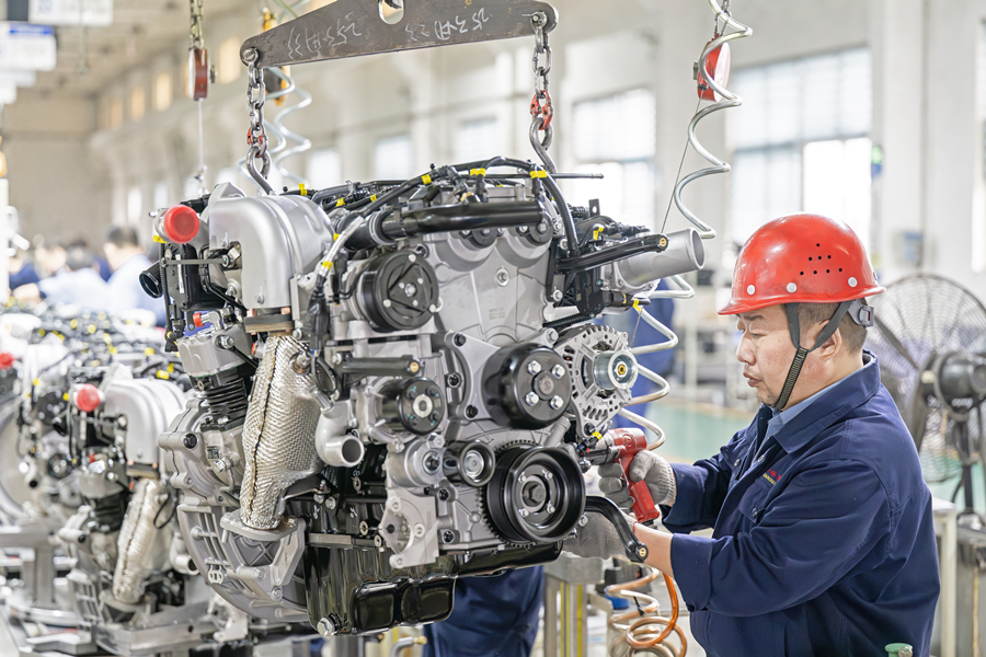 2025年3月11日,工人在滁州悦达实业有限公司查看生产完成的混动发动机缸体。新华社记者杜宇摄