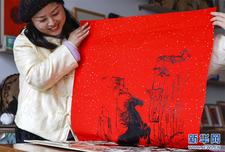 当日,在安徽省黄山市屯溪区河街,市级非遗项目(徽派版画)代表性传承人薛寅以刀为笔,在木板上沉稳推凿,将一匹姿态昂扬的骏马融入方寸之间。作品寓意“奋进吉祥”,以精妙的非遗技艺迎接马年新春。新华网发(施亚磊 摄)