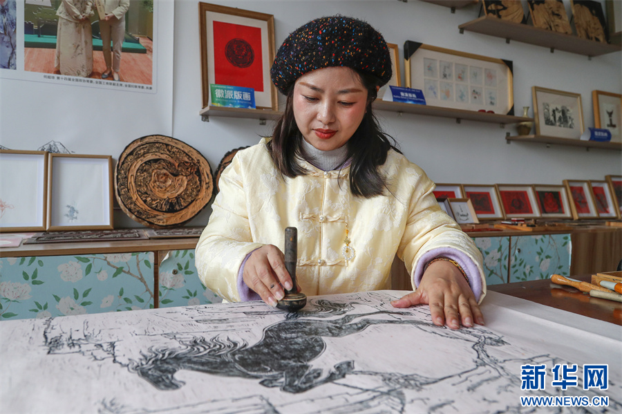 1月6日,在安徽省黄山市屯溪区河街,市级非遗项目(徽派版画)代表性传承人薛寅在拓印版画《骐骥驰骋》。