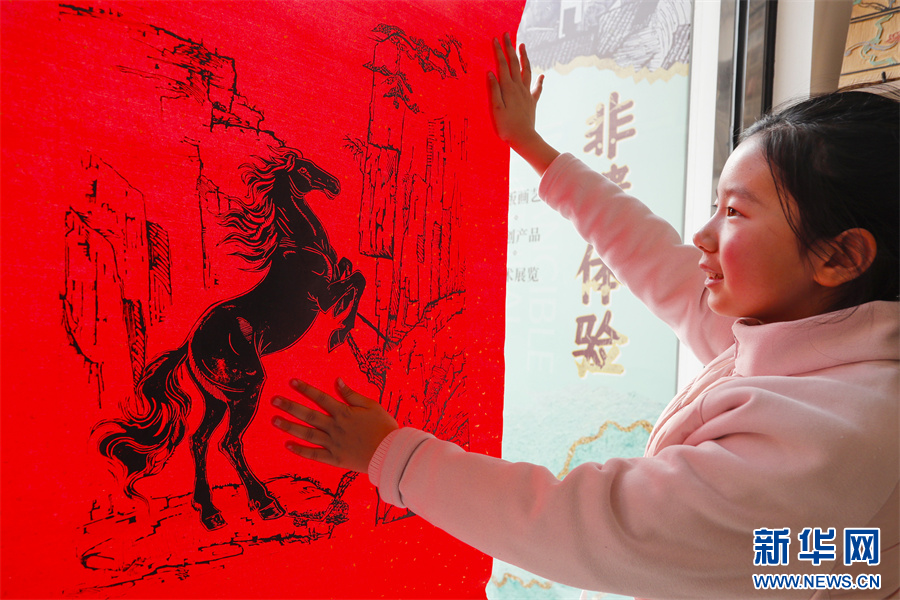 1月6日,在安徽省黄山市屯溪区河街,孩子在张贴版画《骐骥驰骋》。