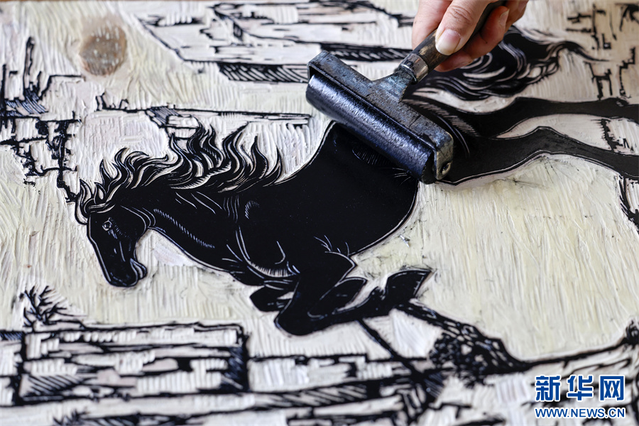 1月6日,在安徽省黄山市屯溪区河街,市级非遗项目(徽派版画)代表性传承人薛寅制作的拓印版画《骐骥驰骋》。
