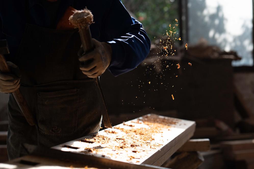 2025年1月6日,工人在黄山徽匠园林古建有限公司厂区加工徽派仿古建筑所需木料。
