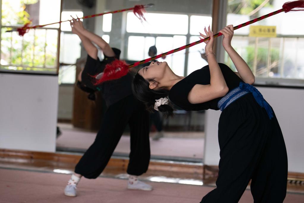 2025年4月29日,“00后”徽剧演员在黄山市徽剧院内练习徽剧的相关动作。