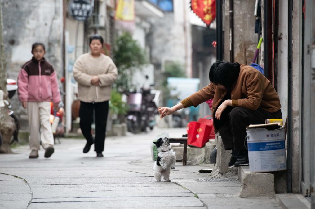 2025年3月23日,在安徽省黄山市歙县徽州古城内,当地居民与小狗互动。