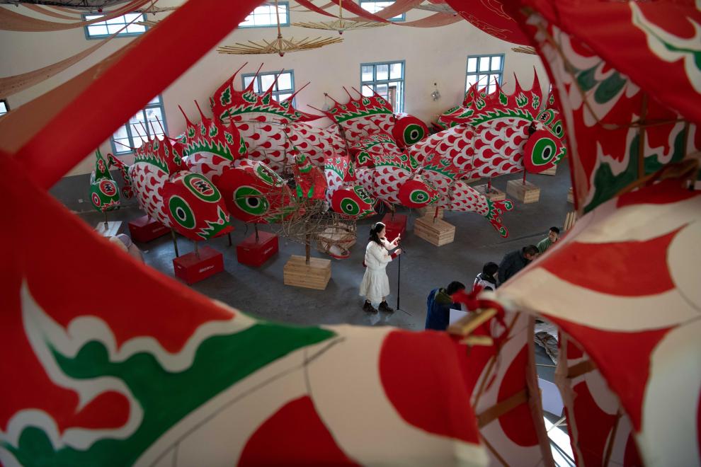 2025年2月8日,在安徽省黄山市歙县溪头镇汪满田村鱼灯工坊内,游客(中)在记录鱼灯制作过程。
