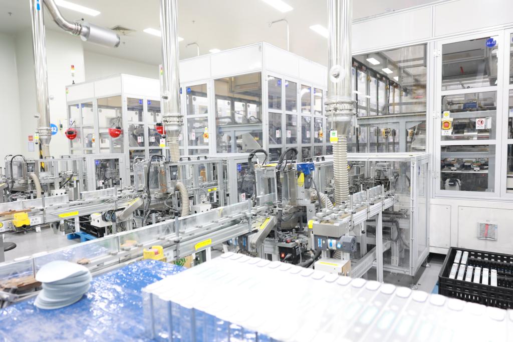 这是中创新航科技(合肥)有限公司169安时三元锂离子动力电池电芯生产线贴膜机。(李燕摄)