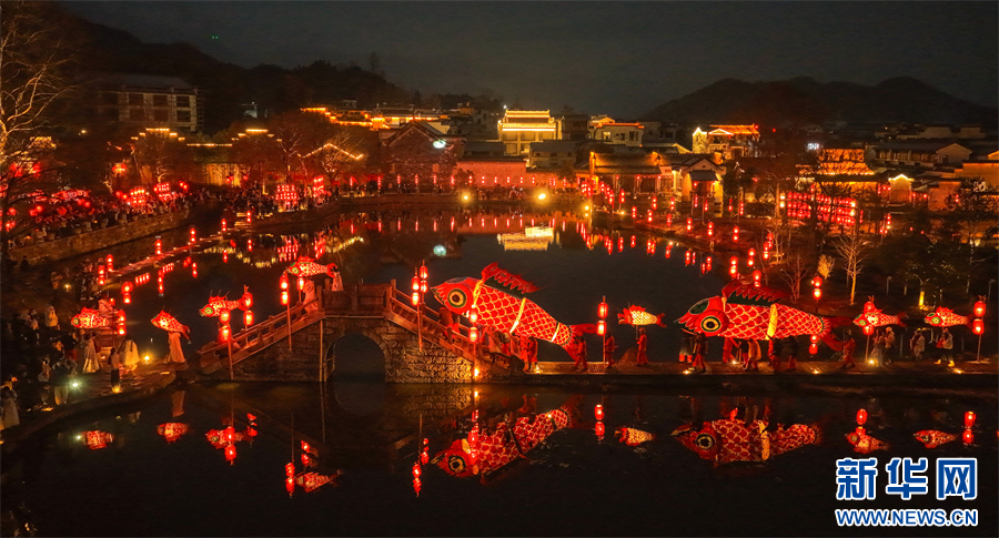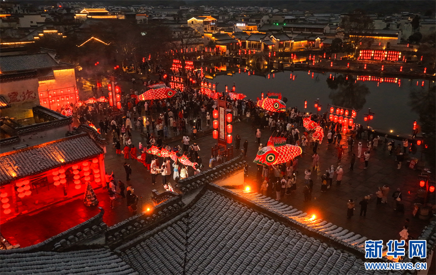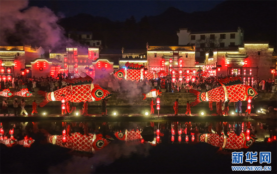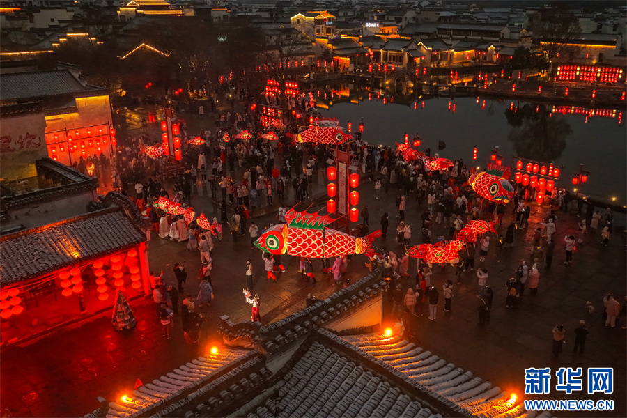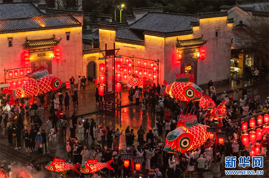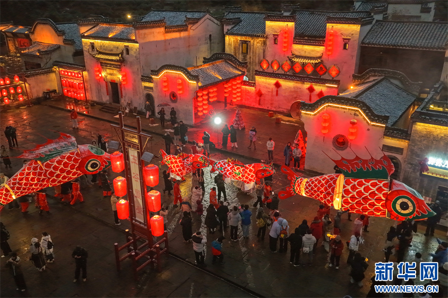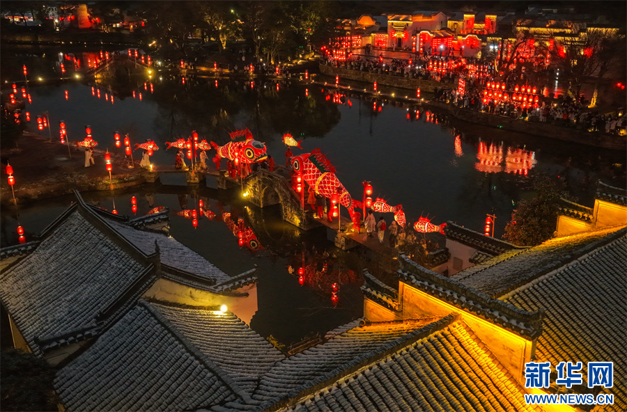 当日,安徽省黄山市徽州区呈坎古村迎来入冬首场降雪,鳞次栉比的徽派民居银装素裹,鱼灯队伍舞动巡游,光影流动,与皑皑白雪交相辉映,宛若浪漫梦境。新华网发(施亚磊 摄)