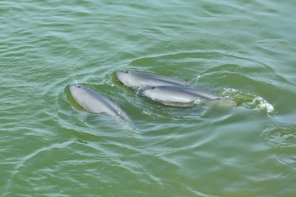 2025年5月19日,安徽省铜陵淡水豚国家级自然保护区内,三头江豚一起浮出水面换气。(储著传 摄)