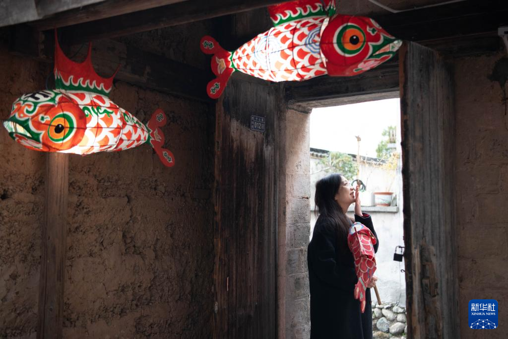 2月7日,在安徽省黄山市黟县碧山村,游客在当地民居门前手持鱼灯留影。
