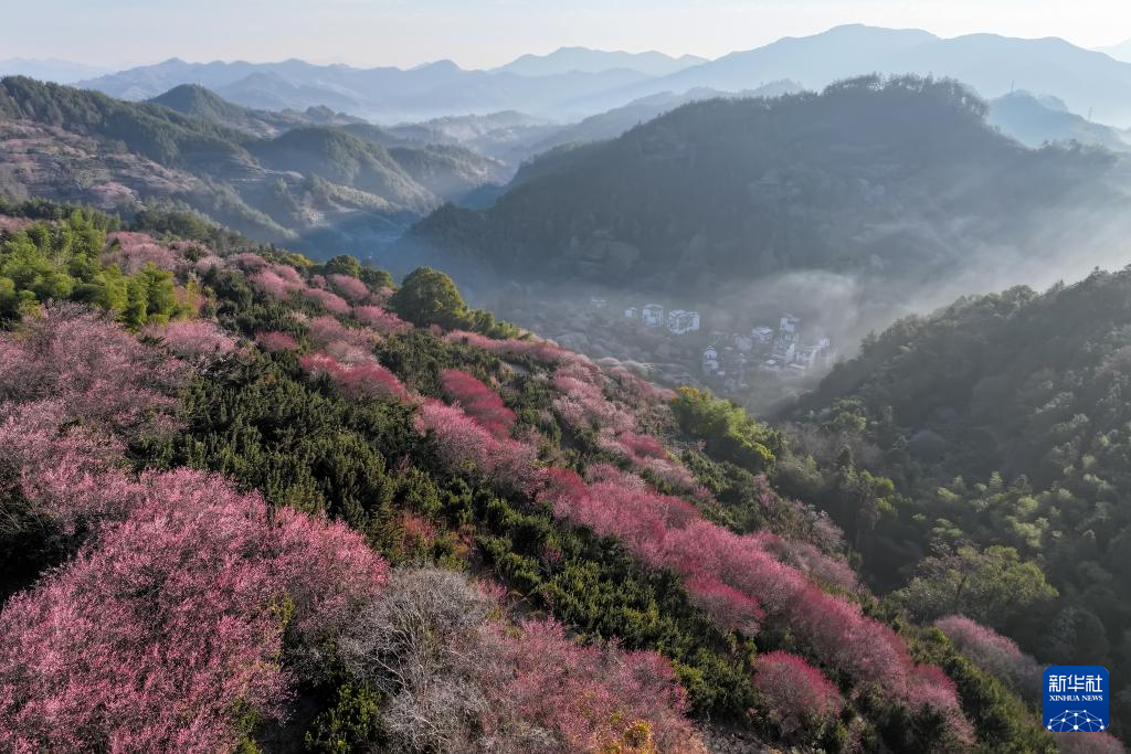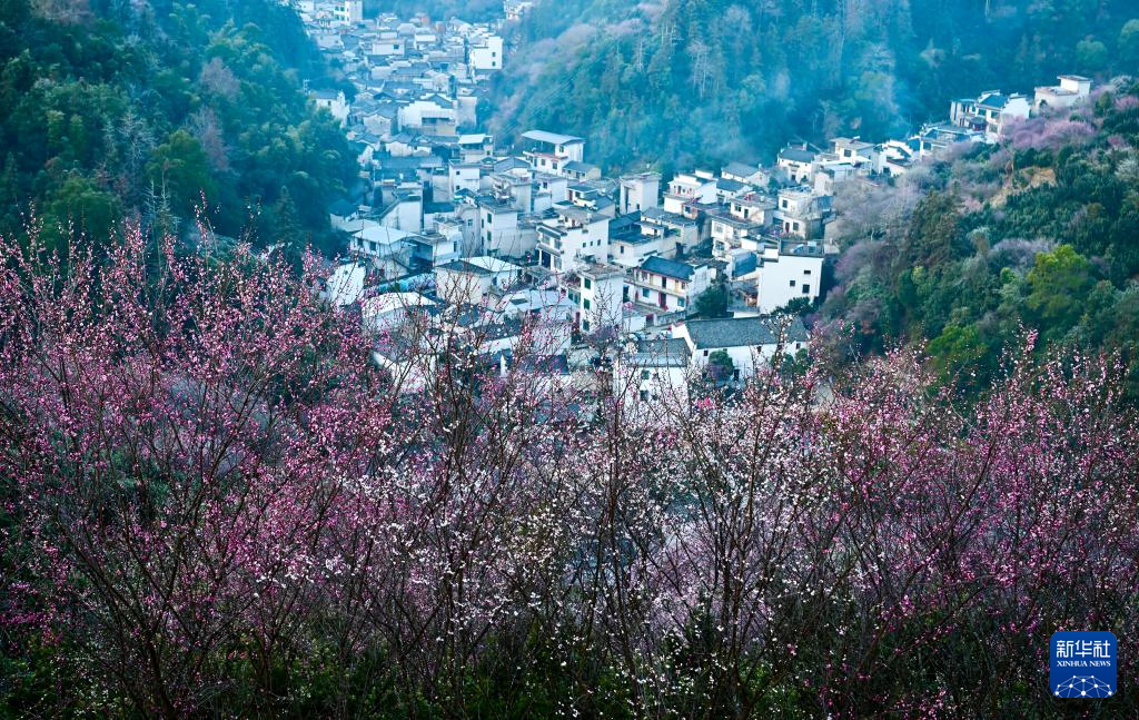近日,在安徽省黄山市歙县雄村镇卖花渔村,漫山遍野的梅花绽放,花海与徽派村落民居相映成趣,景美如画。