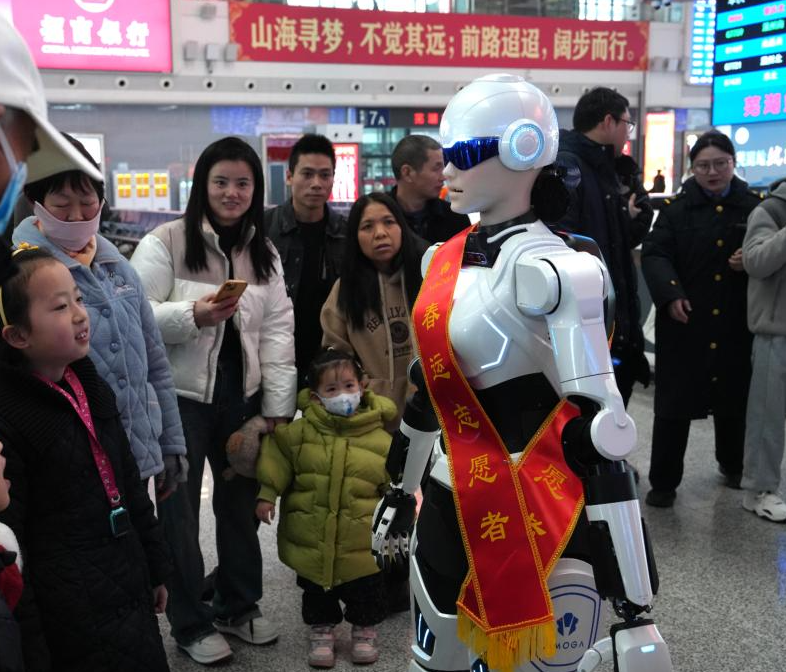 春运期间,人形机器人“墨茵”在芜湖站提供志愿服务。新华社发