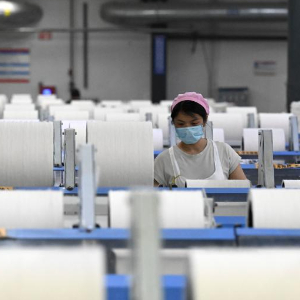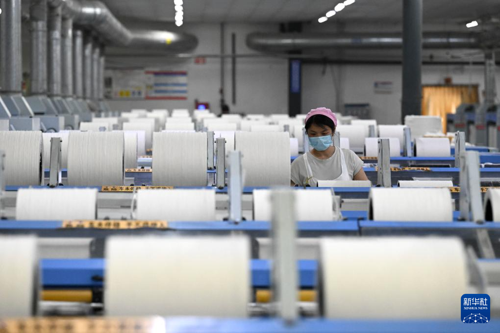 3月12日,工作人员在蚌埠市五河县一家纺织企业生产车间内工作。