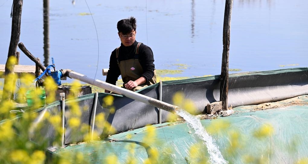 3月13日,在蚌埠市五河县申集镇黄李村的螃蟹养殖基地内,朱彩胜向蟹塘放水。